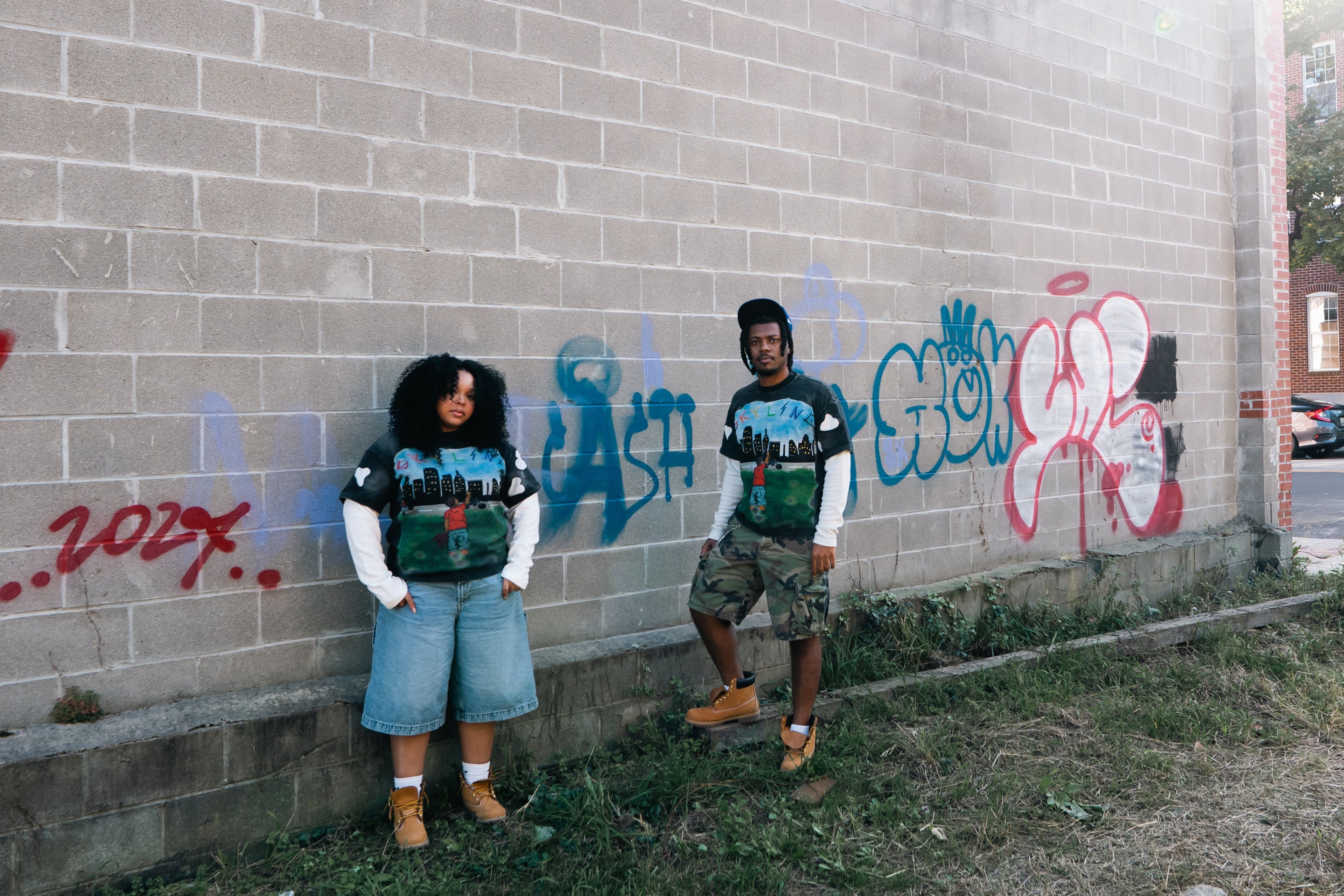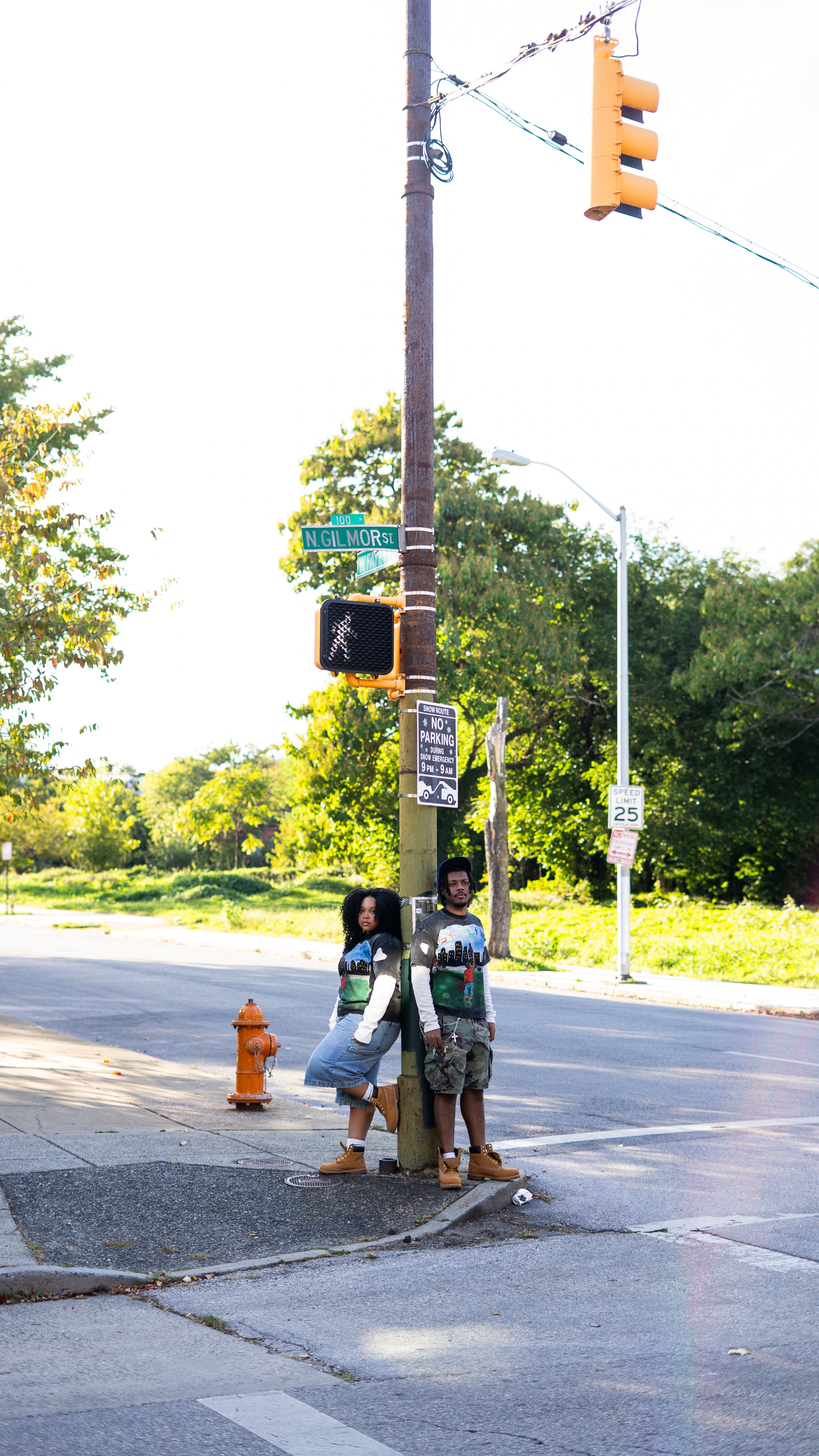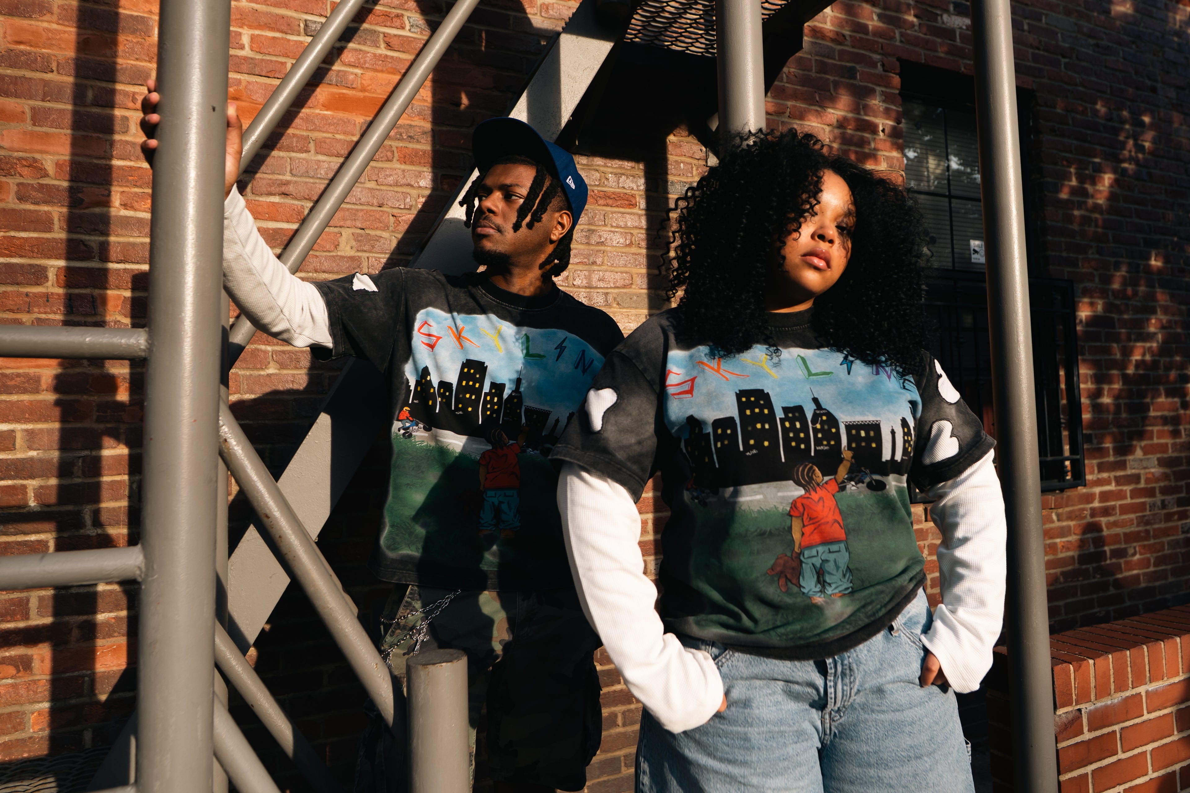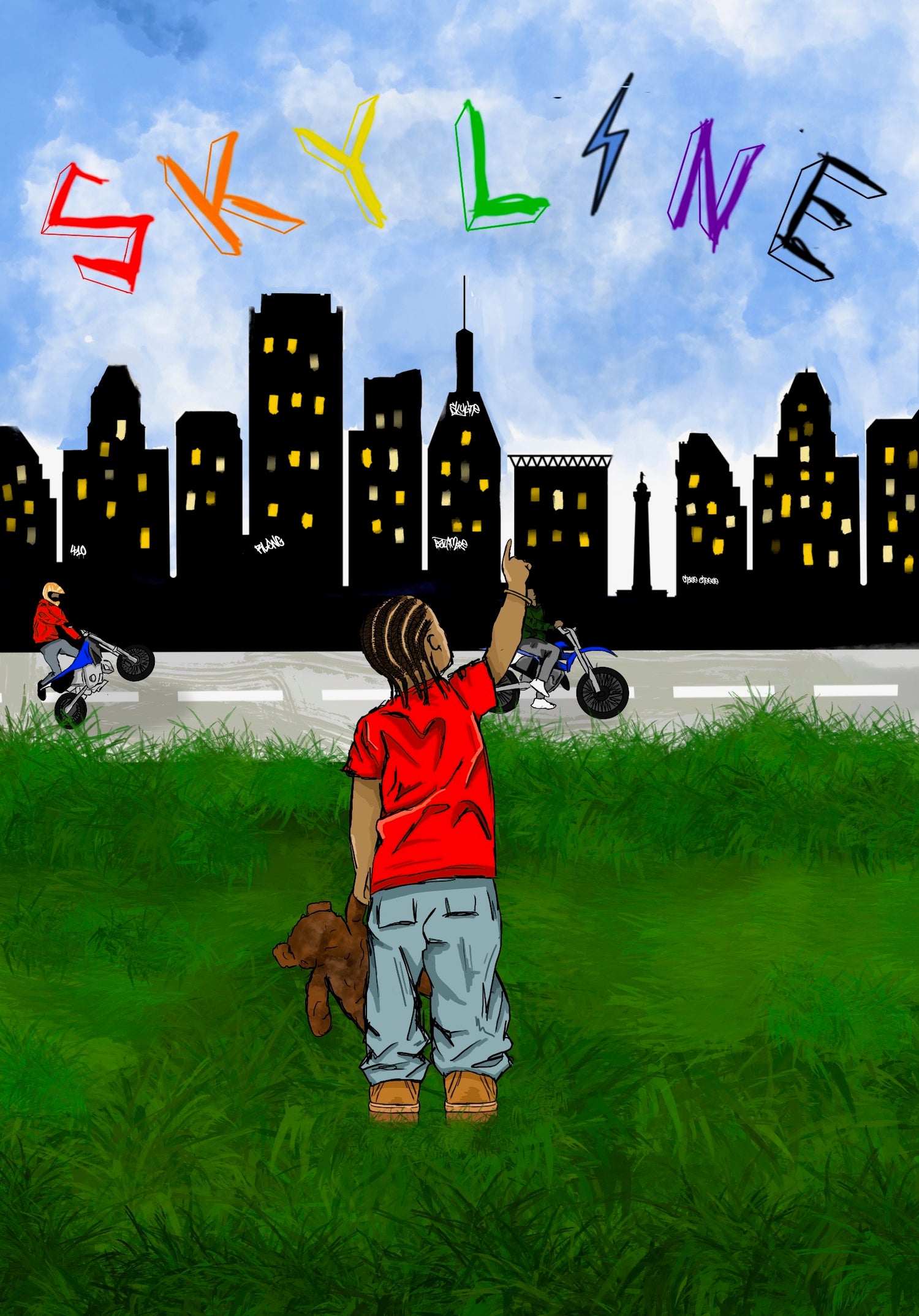 This design represents Baltimore my home, In the picture you can see a young black boy holding his favorite toy looking up at the "SKYLINE". Are brand name is post to represent a rainbow with the different colored letters. You can also, see the city lights which Baltimore is known for with two young men riding dirt bikes.
